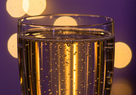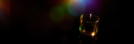 Glass sitting on reflective surface with colorful bokeh lights in the background at night