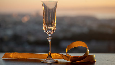 Empty champagne glasses rest on a glass table, showcasing a blurred background that enhances the elegant atmosphere.
