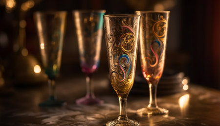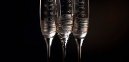 champagne flutes with intricate wire designs, displayed against a dark, elegant background