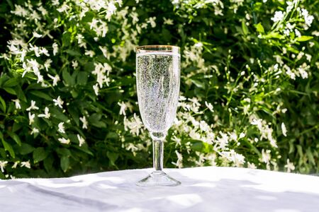 A glass of clean water with bubbles, looks like champagne, stands on a table against the background of blurred flowers. Copy space for your text. The concept of water and a healthy lifestyle