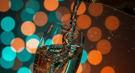 A close-up shot of water being poured into a glass, set against a vibrant bokeh background of orange and blue lights.