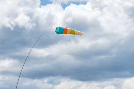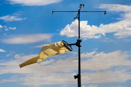 Wind sock. Wind designator against the blue cloudy sky. Wind sleeve flying close up.