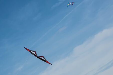 Various kites flying in the blue sky at the kite festival, Zapyskis, Lithuania