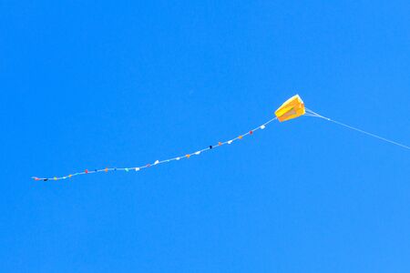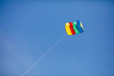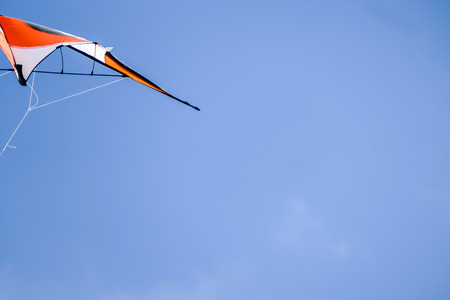Colorful kite flying in the blue sky with copy space.