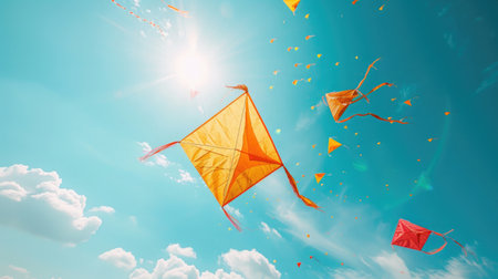 A kite flying against a clear blue sky, is a popular Sinhalese New Year activity. The kites are brightly colored, reflecting the joy and freedom associated with the celebration of new beginnings.