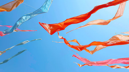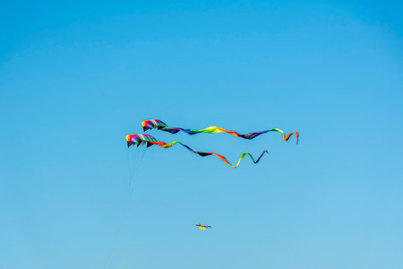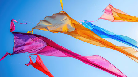 Three vibrant kites soar gracefully in the clear blue sky, creating a vibrant and lively scene, Bright colored kites soaring against a vivid blue summer sky, AI Generated