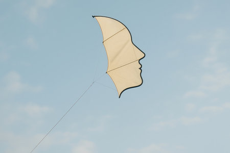 A kite in the shape of a human profile flies in the blue sky. Space for text
