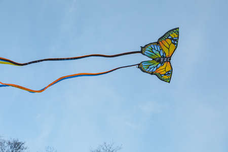 A beautiful, colorful stunt kite, in the blue sky, high in the wind in the form of a butterfly