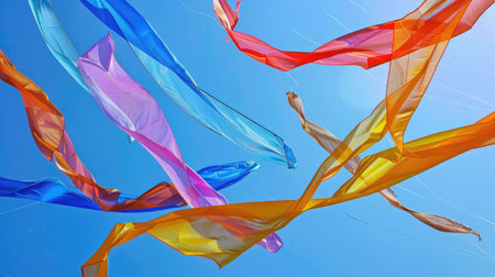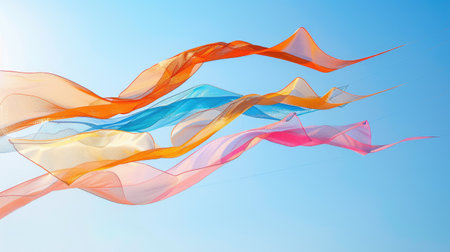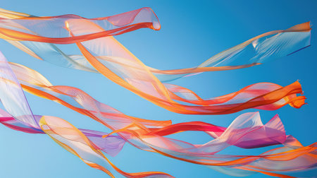 A close-up of an abstract sculpture made from colorful, silk-like fabrics, floating in the air against a clear blue sky background. The colors and shapes create a sense of movement and fluidity, with soft lighting casting gentle shadows on its surface. This is a highly detailed digital illustration that captures intricate textures and reflections to bring out the beauty of the artwork in the style of the artist. --ar 53:30 --v 6.1 Job ID: 865da791-819b-41dd-b0bd-6524c9c84e7a