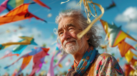 The picture of the kite designer that has been surrounded with the various colourful design of the kite, the kite designer require skill like creative, crafting skill, design skill, knowledge. AIG43.