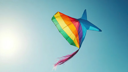 Bright rainbow kite with flowing tails flying in a clear blue sky, colors vibrant and lively, perfect for a sunny day