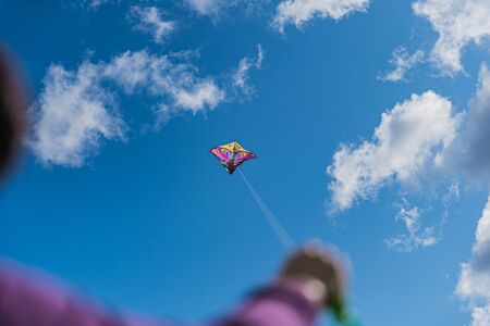 Colorful kite flying in the blue sky through the clouds.