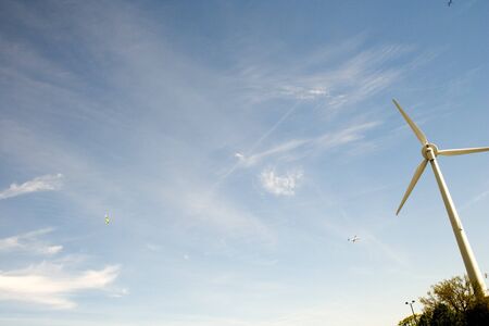 wind turbine and windbag as silhouette against blue sky with fluffy clouds