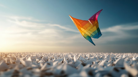 A rainbow-colored kite soaring above a field of plain white kites, symbolizing boldness and individuality