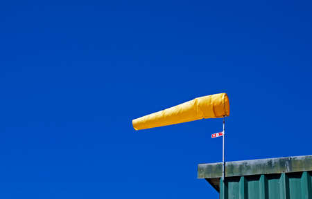 A yellow windsock to measure wind speed and direction against a clear sky