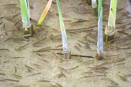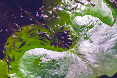 Shoal of small guppy fish or small fancy fish relax and swim over green lotus leaf. Top view of macro group molly fish in laying upper on lotus leaf. Fish find oxygen above water. Selective focus.