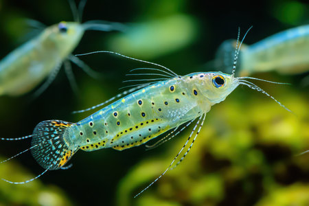 A close-up shot presents a fish with spotted patterns, set within a well-lit aquarium environment. The fish is the central focus, surrounded by aquatic plants and a blurred background. This image highlights natural colors and textures, potentially suitable for educational resources, nature publications, or decorative purposes.