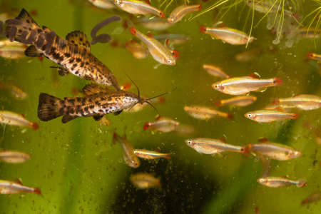 Beautiful freshwater fish belonging to the tetras family in an aquarium planted with elodea