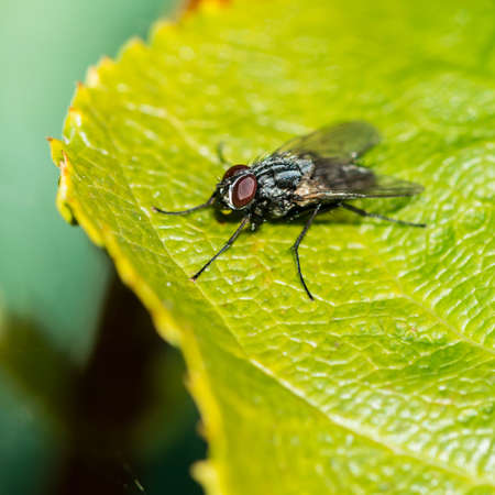 Macro portrait of a housefly on a green leaf
