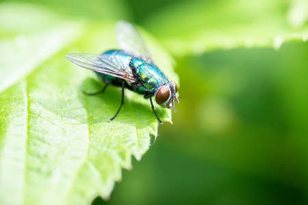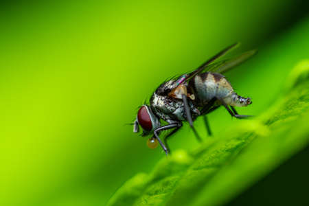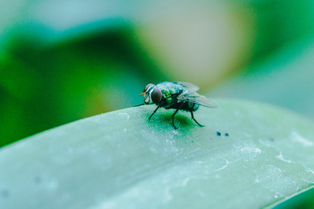 Close up a Fly on green leaf and nature blurred background, Common housefly, Colorful insect, Selective focus.