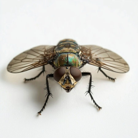 A close-up of a fly perched on a flower petal, its wings catching the light.