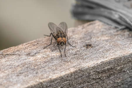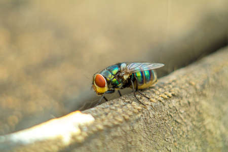 Close up a Fly perched on a tree branch, dry wood with isolated background, Common housefly, Colorful insect, Selective focus.