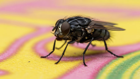 A macro shot of a fly on a colorful background. Shallow depth of field.