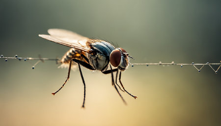 Macro of dew-covered fly, hyper-detailed eyes, nature's patterns, dark contrast.
