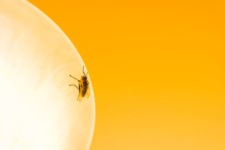 Close-up of a house fly, insect, standing on bright light bulb with yellow cast, looks like a breast, yellow background, unique, odd