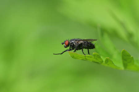 Portrait of a fly on a green leaf in nature .