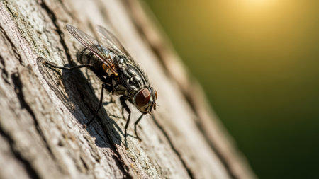 Close-up of common housefly on tree bark in sunlight