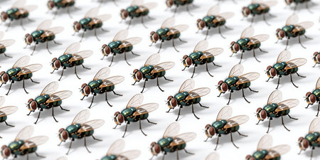A green shiny repeating pattern of flies with brown eyes and light colored wings in realistic cartoon art style on a white background.