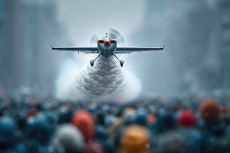 Thrilled spectators watch acrobatic jet planes perform daring maneuvers at a vibrant airshow. American flags wave as smoke trails streak across the sunny blue sky. Capture the excitement and patriotism of this summer event.