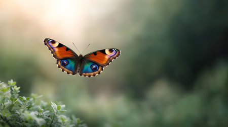 A majestic peacock butterfly takes flight amidst a soft bokeh background, its wings spread wide in the warm sunlight. The image evokes a sense of freedom and natural wonder.
