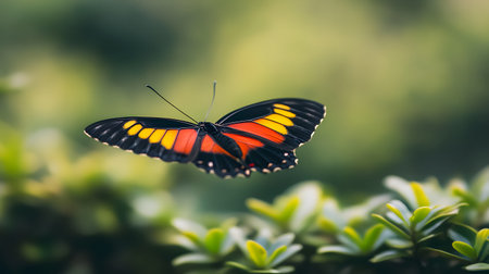 AI-generated A colorful butterfly with orange and yellow wings takes flight. The soft green background creates a serene and natural atmosphere.