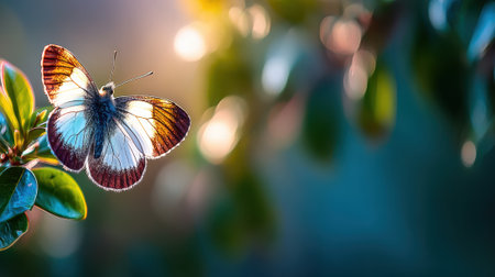 A macro photograph of a delicate butterfly resting on a plant. The soft, warm backlighting illuminates its wings against a beautifully blurred natural background with glowing bokeh lights.