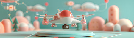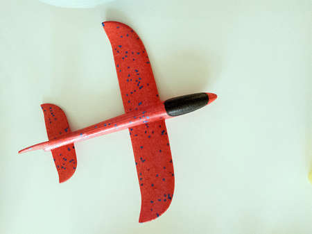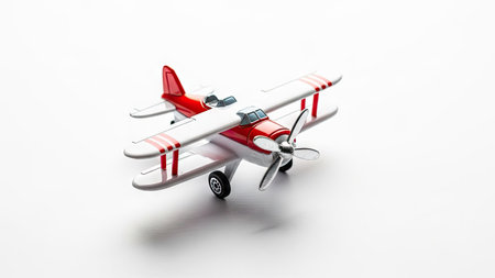A miniature airplane with a red and white color scheme is the main subject. The image shows the toy in a studio setting, with a plain white background. The composition suggests an overhead view. The style presents a clean and simple look. Suitable for advertising or illustrative purposes.