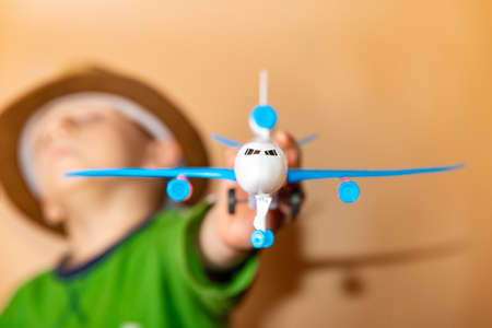 Close-up of a boy's hands with a toy airplane on the background of grass . A child holding a toy airplane on the background of nature.
