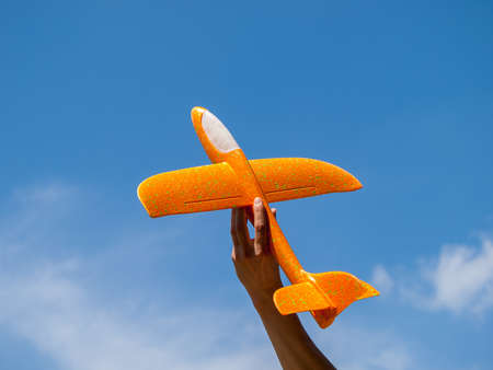 a toy airplane in your hand flies up and forward against a blue sky on a sunny day, a symbol of movement, growth and development, change for the better, rise up