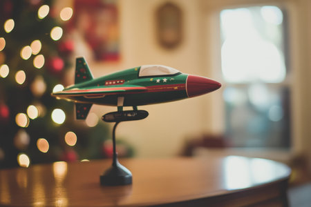 A vibrant model airplane sits on a table with a beautifully lit Christmas tree in the background creating a festive atmosphere.