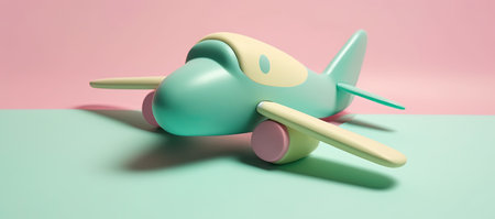 An illustration of a toy plane resting on a pale green background, in a colorful style with light green, light pink, and teal colors by generative AI