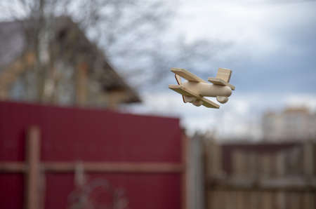 A small wooden toy airplane in the air. flying above the clouds in the sky.