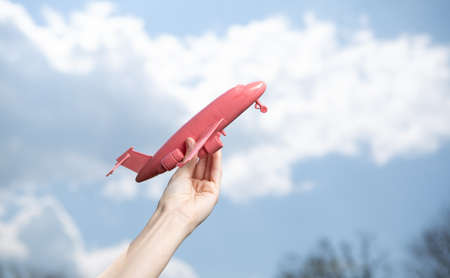 Hand holds a pink airplane model on the background of blue sky with clouds. travel concept