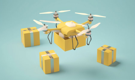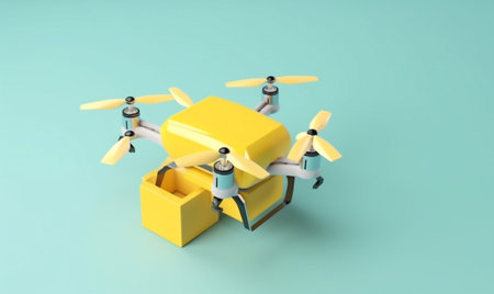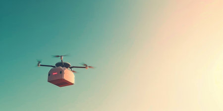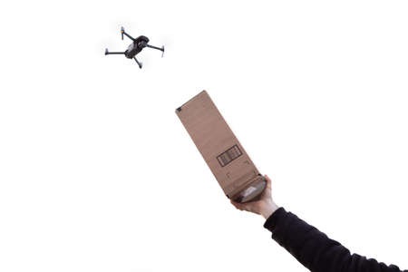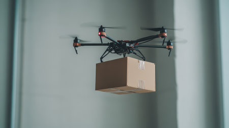Modern drone transporting a brown parcel, hovering against a simple white background, emphasizing delivery automation