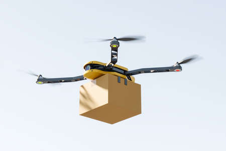 Yellow smart quadrocopter flying with package box in the sky, side view. Modern autonomous bot for order delivery. Mockup copyspace. 3D rendering