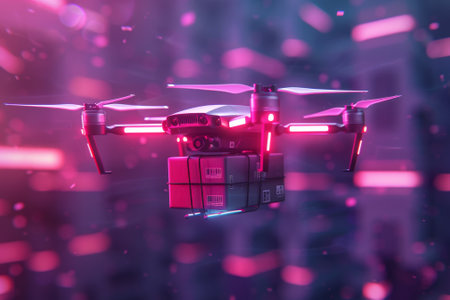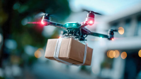 Modern drone delivering a small package over a residential neighborhood during sunset, symbolizing innovation in logistics and transportation.