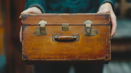 A close-up of a vintage wooden suitcase with leather straps, held by hands, creating a nostalgic and rustic feel.
