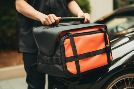 Man standing nearly car with delivery backpack. Person delivers food outdoor. Professional employee, worker. Generative AI