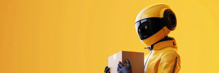 Yellow robot holding a package against a vibrant yellow background. Concept of robotics in delivery and logistics.