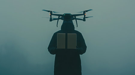 A mysterious figure stands in the fog, holding a remote control for a drone. The scene captures the essence of technology and exploration in a gloomy landscape.